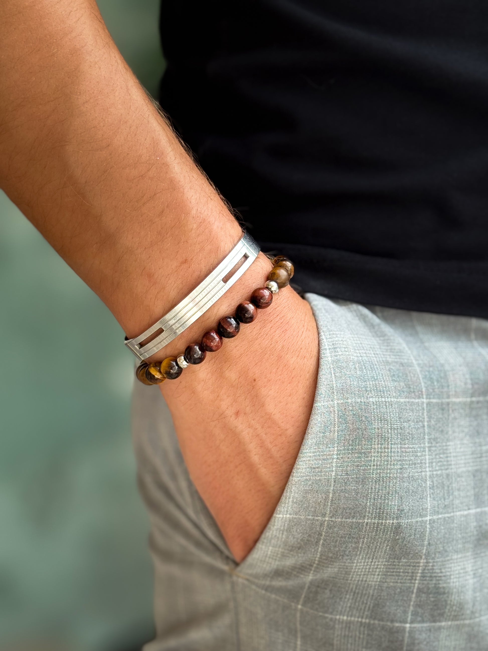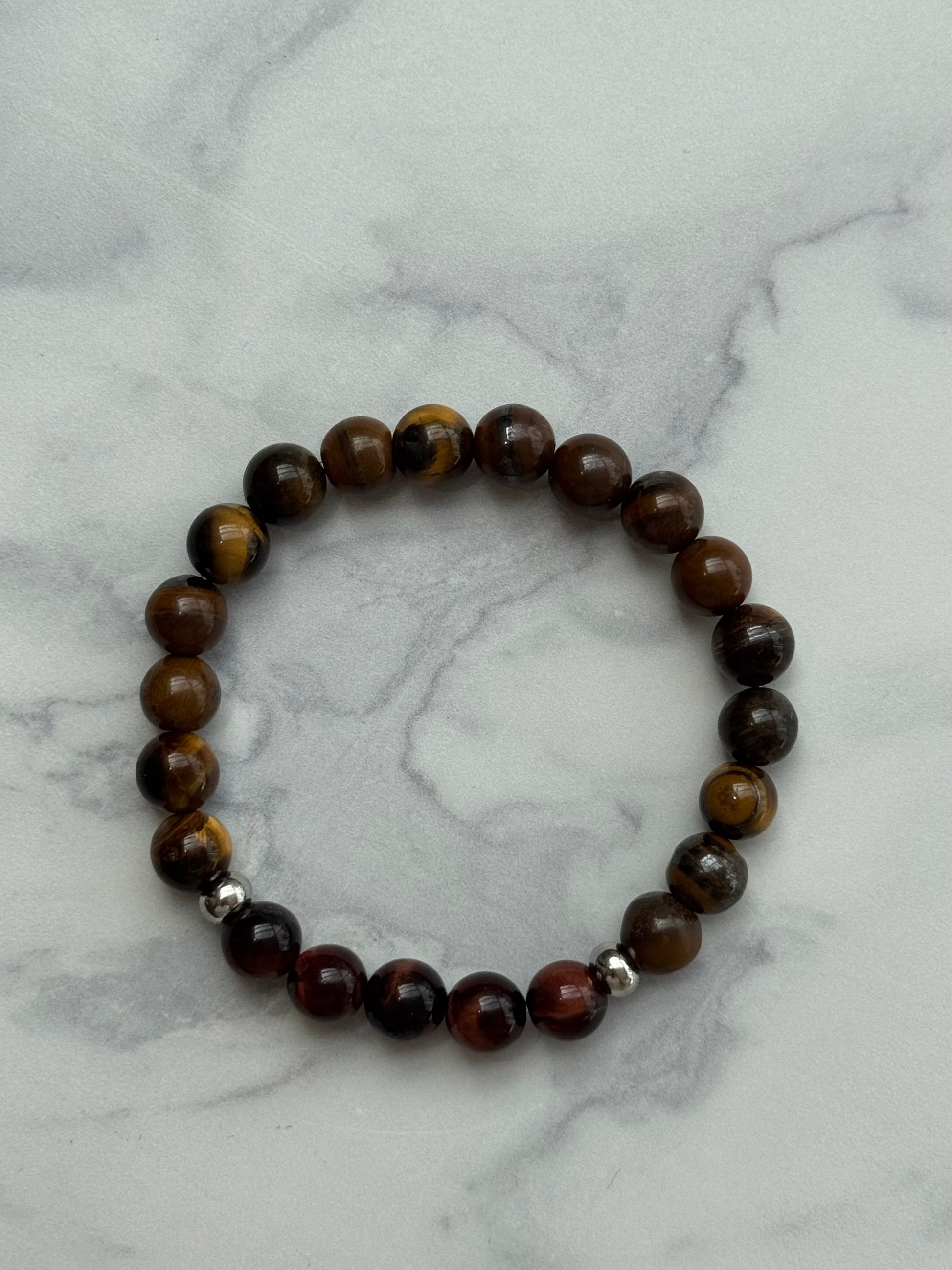 Ce modèle est composé de perles d’œil de tigre satin (8 mm), associées à 5 perles d'œil de taureau, et de deux séparateurs en acier inoxydable aspect argenté.